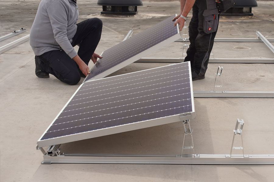 On flatroofs withs foil or bitumen covering the DICONAL® flatroof systems FD-S and FD-OW offer possibilites to mount a solar installation without roofconnection - low ballast and wind optimised.
