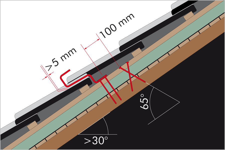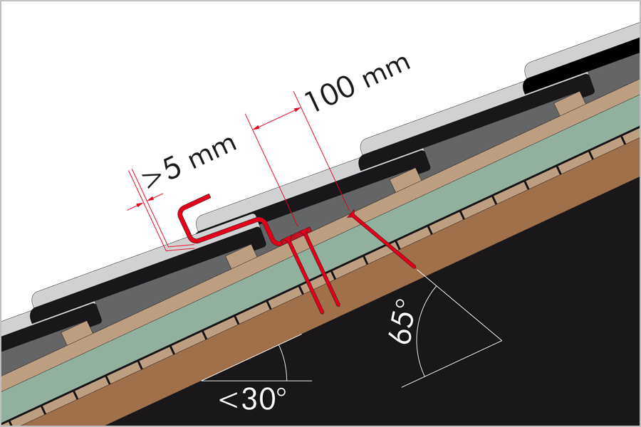 For insulation on the rafters the roof hooks must be fixed with special screws (Z.-9.1-630). If the roof pitch is <30° one, if the roof pitch is >30° two additional stabilizing screws must be inserted.